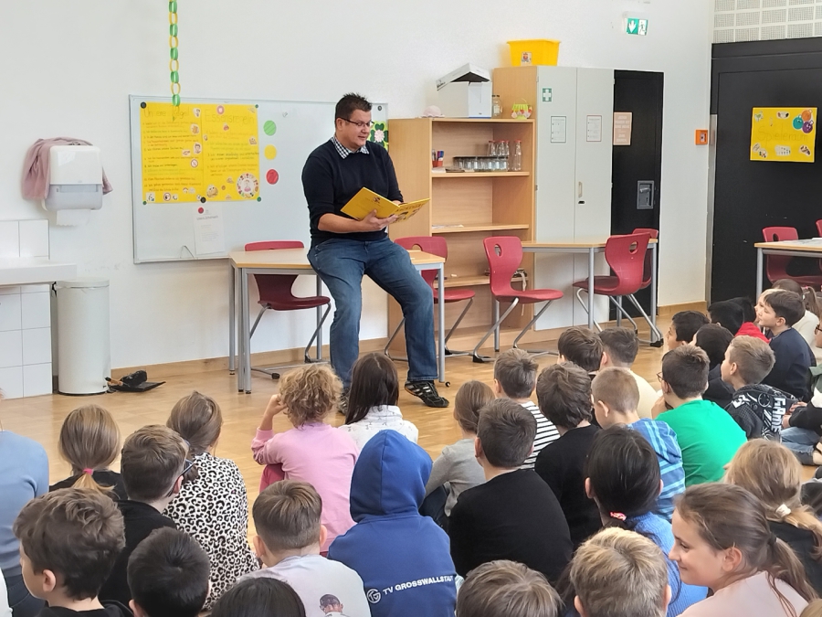 Zunächst las Jochen Till für alle Erst- und Zweitklässler aus Lützelbach und Seckmauern vor, anschließend für alle Dritt- und Viertklässler.